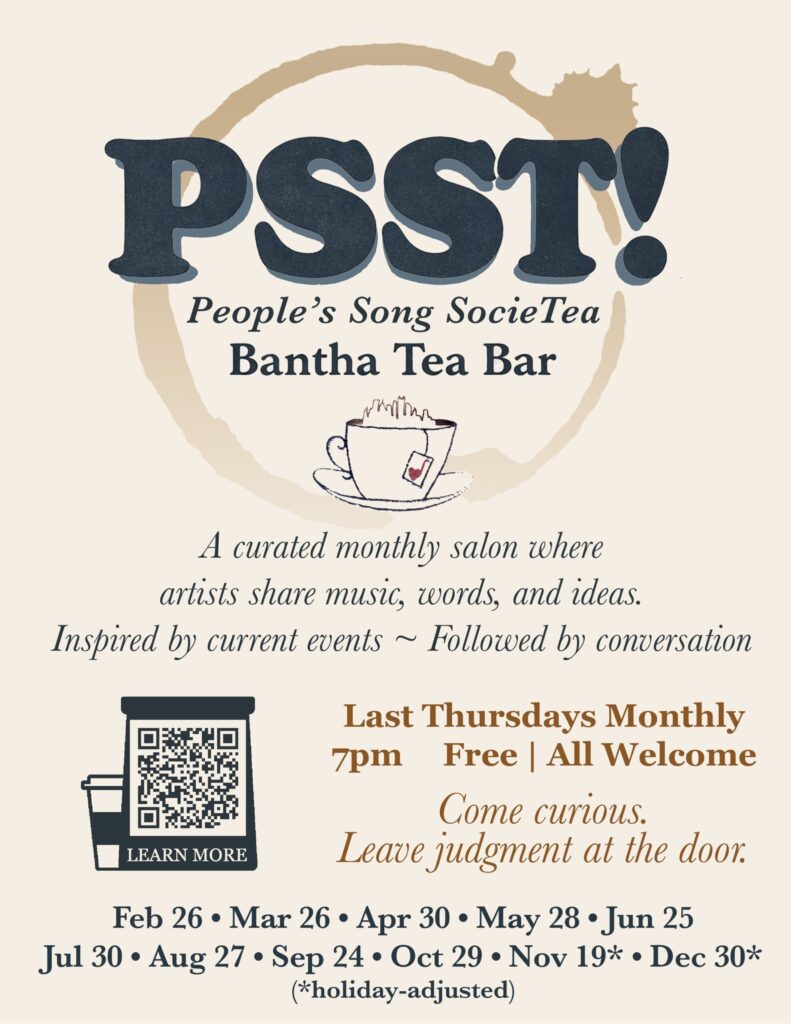 That spark became PSST!, a curated, community-centered salon where artists share songs, poetry, and other short works inspired by current events, followed by conversation. After years of planning and with the enthusiastic support of local artists and Bantha Tea Bar, PSST! launched in 2026 – at a moment when connection, reflection, and creative expression are more important than ever.
